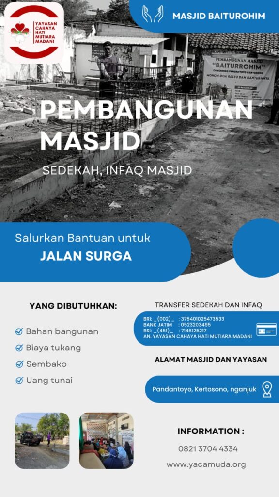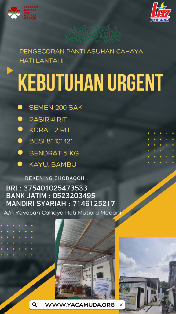 Bismillahirrahmanirrohim😊 Alhamdulillah progres pembangunan panti masih berjalan dan sedang dalam tahap pengecoran pilar. URGENT.Untuk itu kami memohon bantuan dari Bapak,Ibu yang Dermawan supaya pembangunan terus berjalan. Adapun kebutuhan : Pasir 1 Rit @Rp.1.000.000 Koral 1 Rit @Rp.1.800.000 Semen 20 Sak @Rp.55.000/sak Monggo jika panjenengan ada kelonggaran rezeki dan ingin membantu untuk pengecoran pilar. 📥 Rekening […]