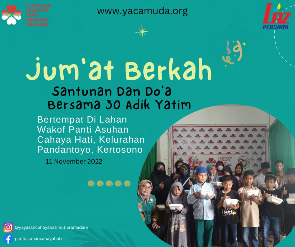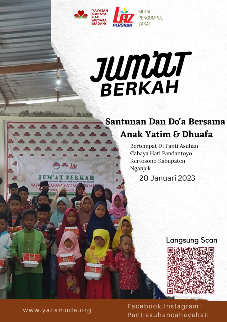 JUM’AT BERKAH Assalamu’alaikum warohmatullohi wabarokatuh😊 Kiranya kesehatan dan keberkahan rezeki selalu terlimpahkan kepada ayah, bunda, sahabat yatim dan keluarga.🤲🏻😊 Mohon izin utk menyampaikan program rutin yayasan Santunan dan Do’a bersama 30 Adik Yatim & Dhuafa bertempat di, Panti Asuhan Cahaya Hati Pandantoyo Kertosono Kab. Nganjuk tgl 23 Desember 2022 Jika Ayah, Bunda & Keluarga ada […]