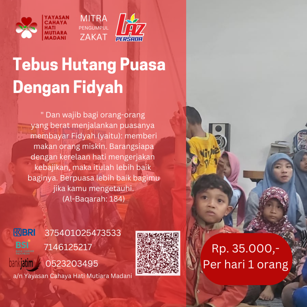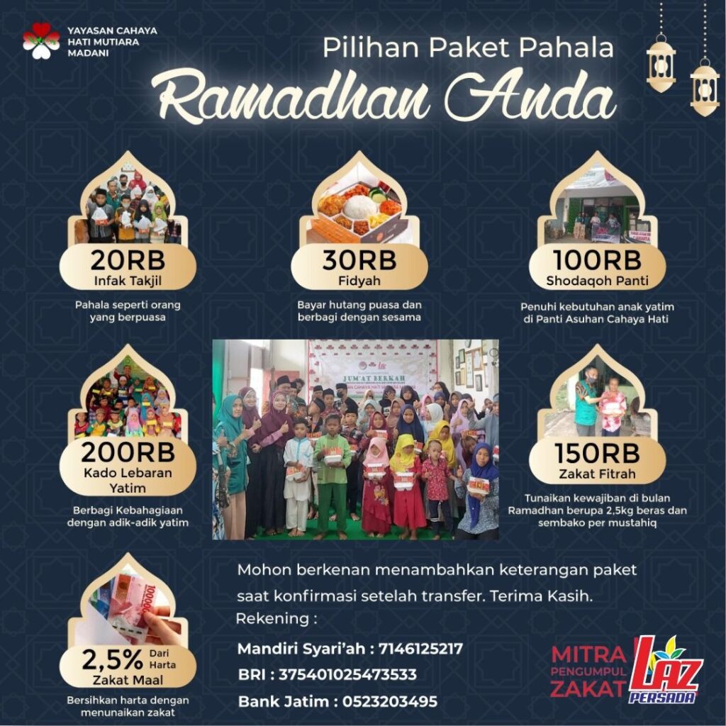 Assalaamualaikum Wr. Wb.😊 Kiranya kesehatan & keberkahan rejeki selalu terlimpahkan kepada Ayah Bubda Sahabat Yatim dan keluarga. Aamiin. Ayah, Bunda, sahabat yatim yang dermawan kami dari yayasan cahaya hati mutiara madani sebagai Mitra Pengumpul Zakat LAZ Persada Jatim Indonesia menerima Zakat Ramadhan, infaq dan Shodaqoh seperti yang tertera di gambar di bawah. Bagi Ayah, Bunda, […]