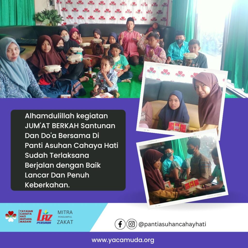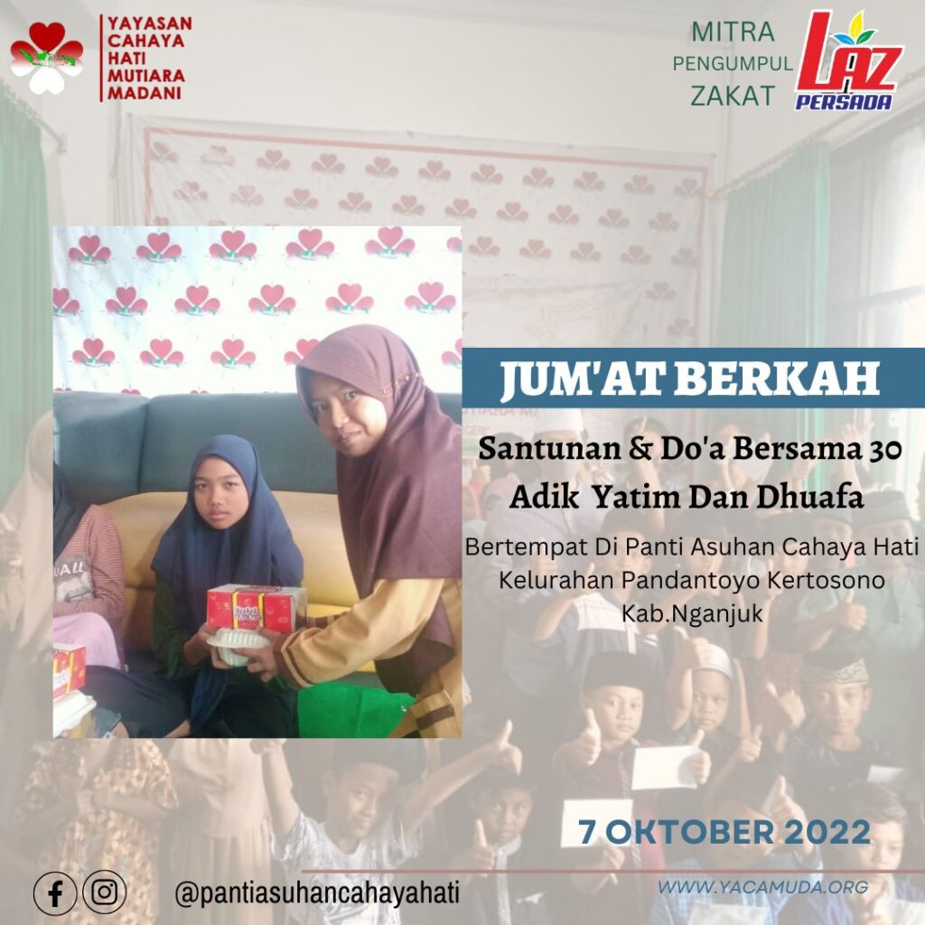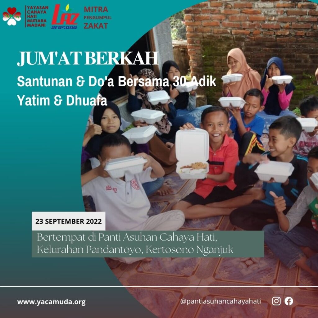 Syukur Alhamdulillah kegiatan Jum’at Berkah Santunan dan Do’a Bersama 30 Adik-Adik Yatim dan Dhuafa yang dilaksanakan tgl 23 September 2022 di Panti Asuhan Cahaya Hati, Pandantoyo, Kecamatan Kertosono berjalan dengan baik, lancar, penuh keberkahan.😊